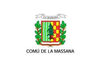 At the official website (image here), the parochial CoA is shown as a samnitic shield with thin red edging (not a heraldic bordure, or is it?), yellow scroll above reading "La Massana," and wreath of two branches with yellow leaves. The blazon is party per pale the I Or three pales wavy Azure and the II chequy Gules and Or.