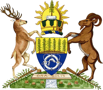 Per fess Or and Azure in chief six Douglas firs on a mount, in base a lifebelt corded, charged on either side with a dogwood flower and encircling a salmon leaping contourné all proper;