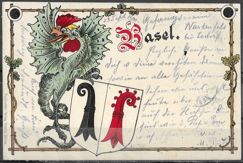 Postcard (postmark 1900) with coat of arms of Basel (common emblem) (source: ricardo.ch).