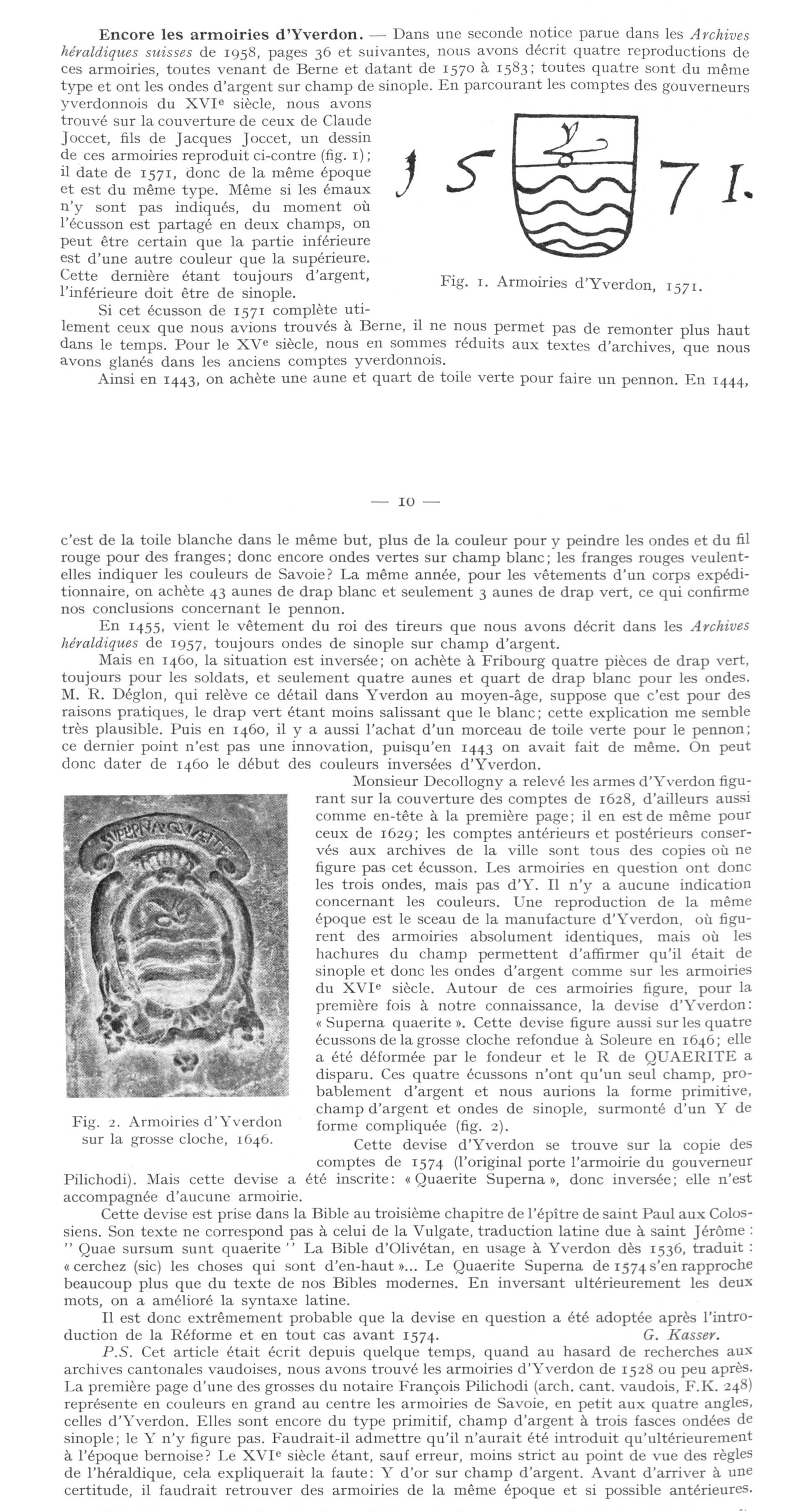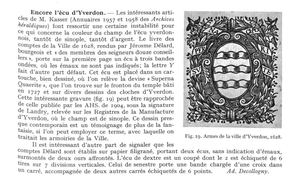 and red-black flamed quarters. In the center a cartouche with Yverdon's shield: Three white wavy bars on green