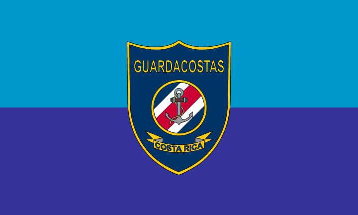 The flag depicts a horizontal bicolor of light blue over purple; with a shield in the center, outlined in gold and in blue. The shield reads GUARDACOSTAS (coast guard name), a ribbon at the bottom reading COSTA RICA,