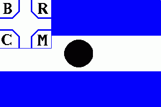 The white flag was divided by a blau-white-blue, centred cross. In the quarters were blue inscriptions "O" (upper hoist), "R" (upper fly), "V" (lower hoist) and "M" (lower fly). In the centre of the flag is a small white disc, fimbriated blue.