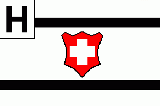 The flag was white with the Swiss arms on centre between two black horizontal lines. The white canton was separated by thin black lines and charged with a black initial "H".