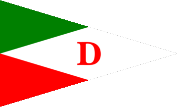 The pennant was parted into two isosceles triangles of green (upper hoist) and red (lower hoist) and a white lozenge at fly with red initial "D".