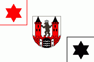 It is a white flag divided by a red saltire. In the centre of the field is a red-edged shield with a red man-trap (term according to German heraldry, a man-trap consists of a number one connected