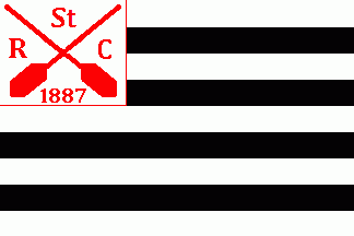 flanked by red inscriptions as follows: "St"(top), "R"(hoist), "C"(fly) and "1887"(bottom).