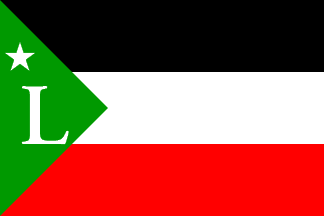 It is a horizontal tricolour of black over white over red with a green hoist triangle bearing a white capital serifed "L"