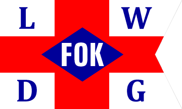 In the centre of the flag is a blue lozenge containing white capitals "FOK".