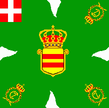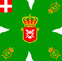 The flag was green with white flames and the arms of the Oldenburg kin, shield Or two bars Gules.