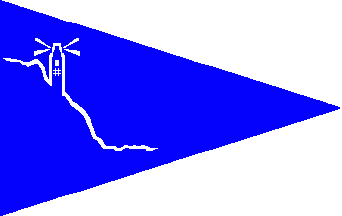 The pennant is blue and displays a white light house in the upper hoist with the white silhouette of a steep coast.