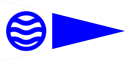 The pennant is parted per chevron pointing to hoist of blue and red. On the blue part at hoist are two white sails.