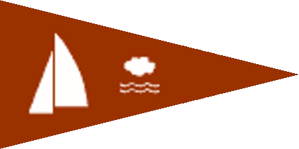 The pennant is white fimbriated blue, shifted to hoist is a blue sailing boat and at fly a red inscription "SKS" with three annexed red dots.