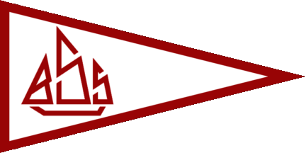 The pennant is white fimbriated red. Shifted to hoist is a red sailing ship with three sails shaped as "BSS". Brøndby Strand is a southern suburb of København.