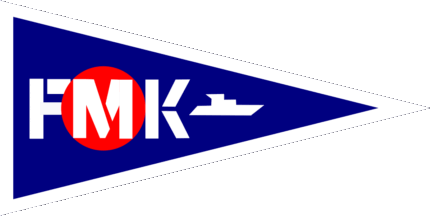 Fisketorvet is a big shopping mall on the western bank of København's Sydhavn (= South Port). The pennant is blue fimbriated white with white inscription "FMK", the "M" being on a red disc. At fly is a white motor yacht.