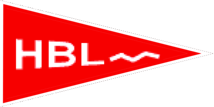 The pennant is red fimbriated white with white inscription "HBL" at hoist and a white wavy line at fly.