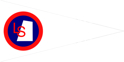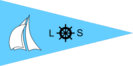 The pennant is light blue with a white sailing ship without hulk at hoist and black initials "L" and "S" flanking black steering wheel. Lohals is a little harbour at the northern tip of Langeland Iskland.