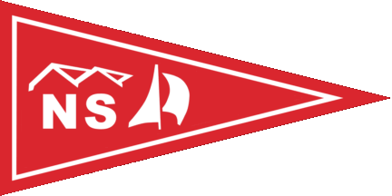 The pennant is red either cotized white-red (see left image above) or fimbriated white (see right image above). Shifted to hoist is a white inscription "NS" under two gables (of a boat house).