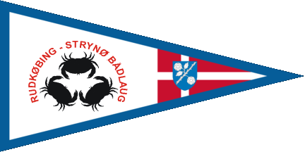 The pennant is white fimbriated blue. At hoist under a red embowed inscription „RUDKØBING-STRYNØ-BÅDLAUG“ are three black crabs in triangle.