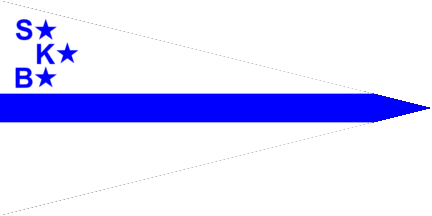 The pennant is white parted by a blue horizontal line, in upper hoist are blue initials "SB", in lower hoist two blue waves in pale.