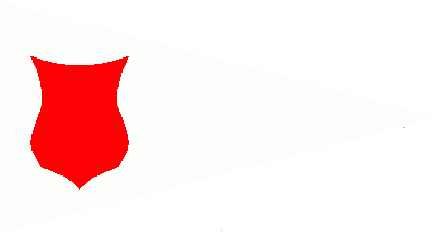 The pennant is white, parted by a red chevron, at hoist is a yellow 5-point star, at fly the pennant is parted by a red horizontal line.