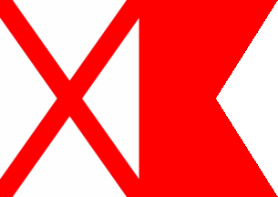 The pennant is red. Shifted to hoist is a white disc charged with a red lion passant guardant and flanked by white initials: "V" over "S" at hoist and "K" at fly.