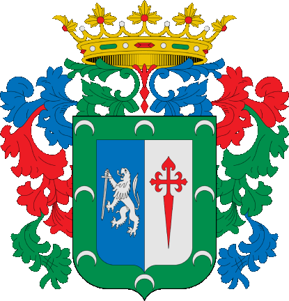 Description: Shield divided. First, azure, a rampant silver lion holding a sword of the same in its right paw. Second, argent, a red cross of St. James. A bordure vert with eight reversed silver crescents. For a crest, an open royal crown and an external ornament of mantling.