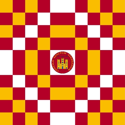 Superimposed on the vexil and in the center, a circular emblem in gules with a gold castle surmounted by the two steel keys, all in the same position as the shield. Around it, between simple glyphs, the legend: CONCILII SANCTUM STEPHANUM.”