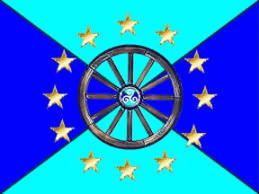 2. The Facebook page of the European Yenish Union features another flag, this time defaced by a wheel (ala the red wheel in the Romani flag), a triskelion (some Yenish claim Celtic ancestry) and twelve stars.