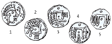 techniques which prevailed during the "barbarian period" which followed the Carolingian Renaissance. It must simply be seen as the representation of a sovereign's profile surmounted by a diadem, representing Louis the Pious, son of Charlemagne (bezant no. 1). The clumsiness of the copyist of bezant no. 2 is at the origin of all this; bezant no. 3 is only a simple 90° rotation of bezant no. 2). We can clearly see that the copyist of bezant No. 4 had absolutely no idea what he was copying and replaced the three bars representing the lips and chin of the face with a fleur-de-lis. Bezant No. 5 is the one found on the arms of Chartres."