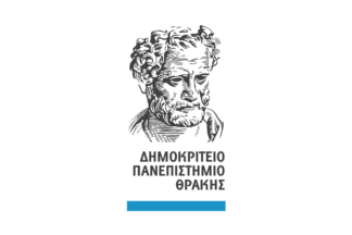 The flag of Democritus University of Thrace in Komotini is white with a logo bearing a portrait of a scholar above the name.