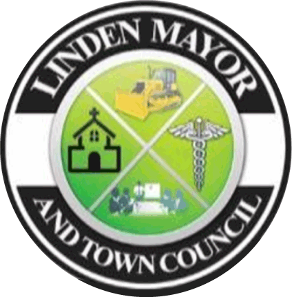 The town government logo is circular, having a white and black outline. Its outer ring is composed of three bands: black-white-black (horizontal). At the top, "LINDEN MAYOR"; below "AND TOWN COUNCIL" are read in white. The inner circle is outlined in silver and divided into four triangles, having an X shape, over a green field. The left triangle depicts a church for faith; the right triangle depicts a caduceus for health; the upper triangle depicts a bulldozer for public works; and the lower triangle depicts the town council in session.