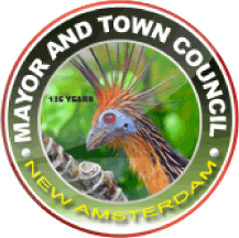 The town council seal depicts, in its center, an image of the Canje Pheasant as the national bird. This inner circle is outlined in white; its outer ring is a gradient of black and gold (top to bottom). The top reads "MAYOR AND TOWN COUNCIL" with dots dividing the ends of the legend, all in white. Below is "NEW AMSTERDAM" in gold. This outer ring is outlined in white then red.