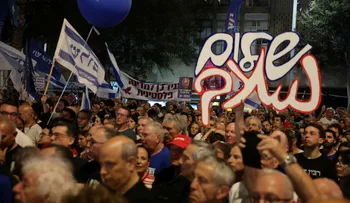 Credit: Moti Milrod. The blue slogan in the white/blue flag that mimics the Israel national flag reads
