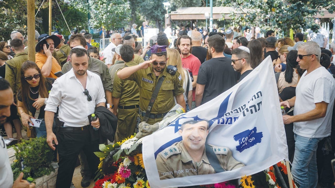 Hamami during his funeral in Tel Aviv, on Tuesday [4 Nov. 2025], behind a flag bearing his likeness.