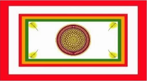 The flag contains the emblem centered inside sequential red-white-red-yellow-green boxes.