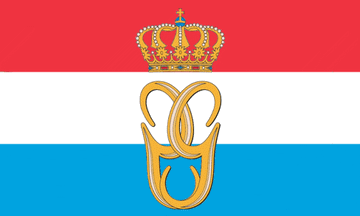 Several authors (for instance, Smith [smi75b], Barraclough & Crampton [c2b81] and Pedersen [ped80]) show a square blue flag with the lesser national arms with the Order of the Oaken Crown around it, and seven golden billets. According to Barraclough & Crampton, the flag was adopted soon after 1964; according to Pedersen, it is only used on means of transport.