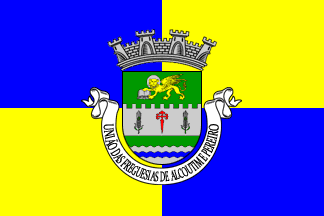 Shield Vert, on a wall embattled Argent issuant from flanches a cross of Saint James Gules between two wheat ears Vert, in chief a winged lion passant guardant Or with nimbus Argent holding an open book Argent, on base wavy Argent a bar wavy Azure. Mural crown Argent with four visible towers (town rank) and long white scroll, as often used by united communes, with inscription in black capitals "UNIÃO DAS FREGUESIAS DE ALCOUTIM E PEREIRO".