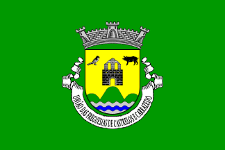 Shield Or a church Sable masoned Argent with port and windows Or, in dexter chief a sinister facing sparrow statant Sable garnished Or, in chief sinister a pig Sable statant garnished Or, issuant from flanches and base wavy Argent, charged with a bar wavy Azure, a mound of three coupeaux Vert. Mural crown Argent with three visible towers (commune rank) and Mural crown Argent with three visible towers (village rank) and white scroll with inscription in black capitals "UNIÃO DAS FREGUESIAS DE CASTRELOS E CARRAZEDO".