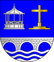 The band-stand is taken from the arms of Queijasc, the almost canting cross from those of Cruz Quebrada, and the bridge (and also the cross) from Algés.