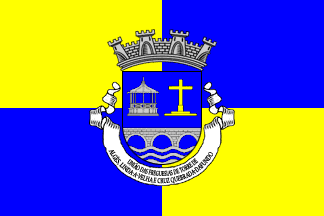 It is a typical Portuguese communal flag, with the coat of arms centred on a field quartered of yellow and blue.