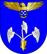 Shield Azure a three-leaf yam Argent eradicated Or, in chief a goshawk displayed Or grasping an escutcheon Azure charged with five plates in quincunx.