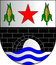 Shield Argent a bridge Sable masoned Argent issuant from flanches and from base wavy Azure charged with a bar wavy Argent, in chief an estoile Gules between two maize ears Or leafed Vert.