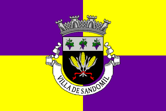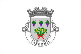 Shield Sable three maize ears Or leafed Argent and tied at their stems by a ribbon Gules, on chief Argent three grape bunches Purple leafed Vert Mural crown Argent with four visible towers (town rank) and white scroll reading in black upper case serifed letters "VILLA DE SANDOMIL".