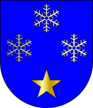 Shield Azure three snow crystals Argent, in base an estoile Or.