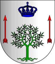 Shield Argent an olive tree eradicated Vert fructed Sable, flanked by two arrows Gules, in chief a Marian crown Azure.