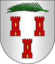 Shield Argent three towers Gules masoned Sable with port and windows Or, in chief a palm frond Vert in fess.