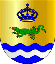 Shield Or a wall lizard Vert armed and langued Gules, in chief a Marian crown Azure gemmed Or, on base wavy Azure a barrulet wavy Argent.