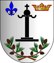 Shield Argent a pillory Sable, in dexter chief a fleur de lis Azure, in sinister chief a royal coronet Or fimbriated Gules, in base two pine boughs Proper in saltire.
