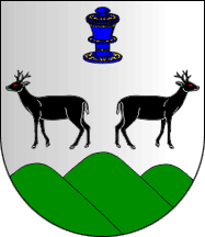 Shield Argent two roe deers addorsed Sable animated Gules, in chief a scent bottle Azure garnished Or, issuant from base a mound of three coupeaux. Mural crown Argent with three visible towers (village rank) and white scroll reading