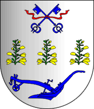 Shield Argent three broom boughs Vert flowered proper and arrayed in fess, in chief two keys Azure with their wards